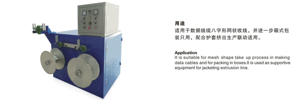 適用于數據線纜八字形網狀收線,并進一步箱式包裝只用,配合護套擠出生產聯動適用。